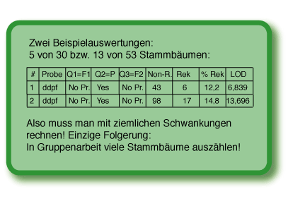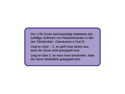 3. Genlokalisierung 3.2 Sie sollten schon nach der Auszählung von 3-5 Stammbäumen deutlich weniger als 50% Rekombinanten erhalten. Aber wieviele Stammbäume muss man auszählen um eine sichere Aussage zu erhalten? Die hohen Anzahlen eines Modellorganismus wie Drosophila erreicht man fast nie. Protokollieren Sie die Entwicklung der Prozentzahl und des LOD-Score! Die Stammbäume von PedigreeLab realitätsnah zufällig gestreut!! |